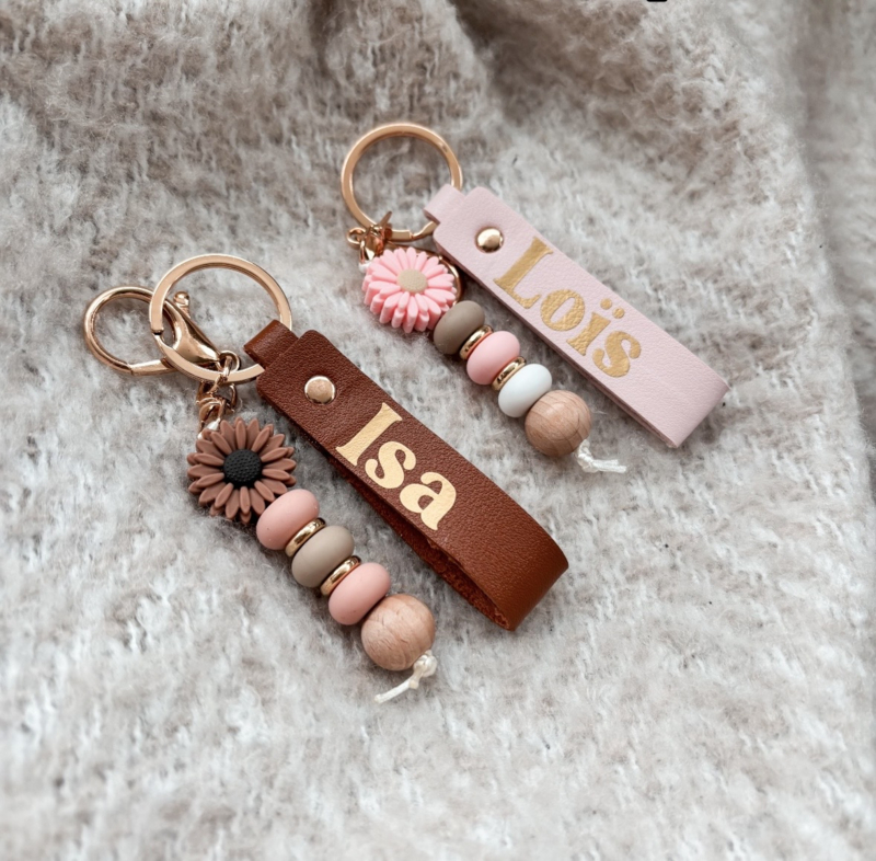 Deze sleutelhanger met naam in zachte, natuurlijke tinten heeft een tijdloze en rustige uitstraling.